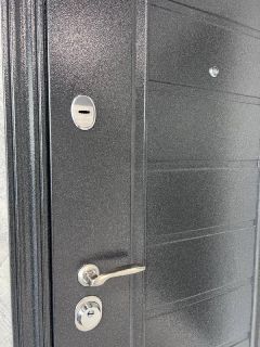 Полотно толщиной 74 мм, усиленное металлическими элементами, холоднокатаная сталь 1,2 мм в полотне двери.