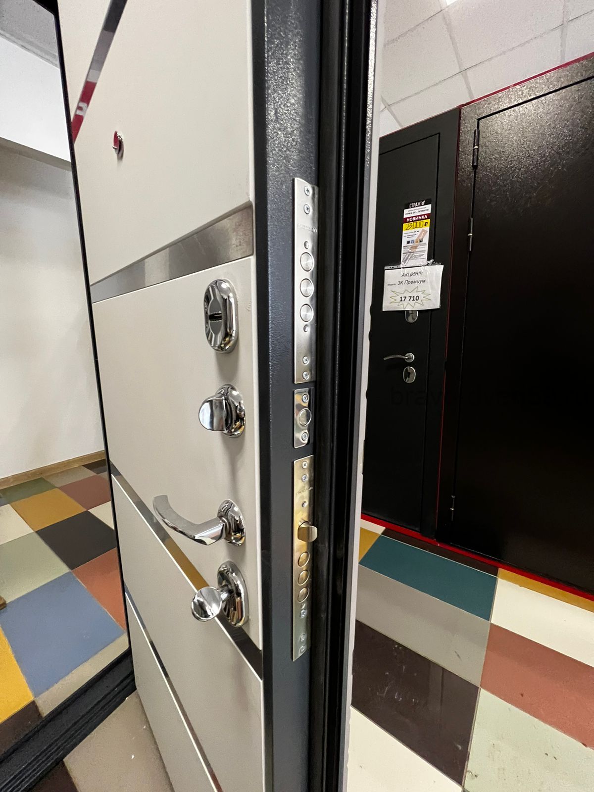 Софт Милк 3К Х42 металлическая трехконтурная входная дверь предлагается в цвете наружней панели Софт платина