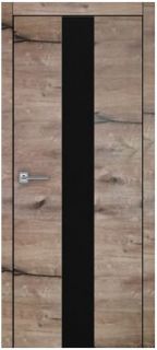 Межкомнатная дверь в стиле модерн с вертикальной, широкой вставкой черного каленого стекла.