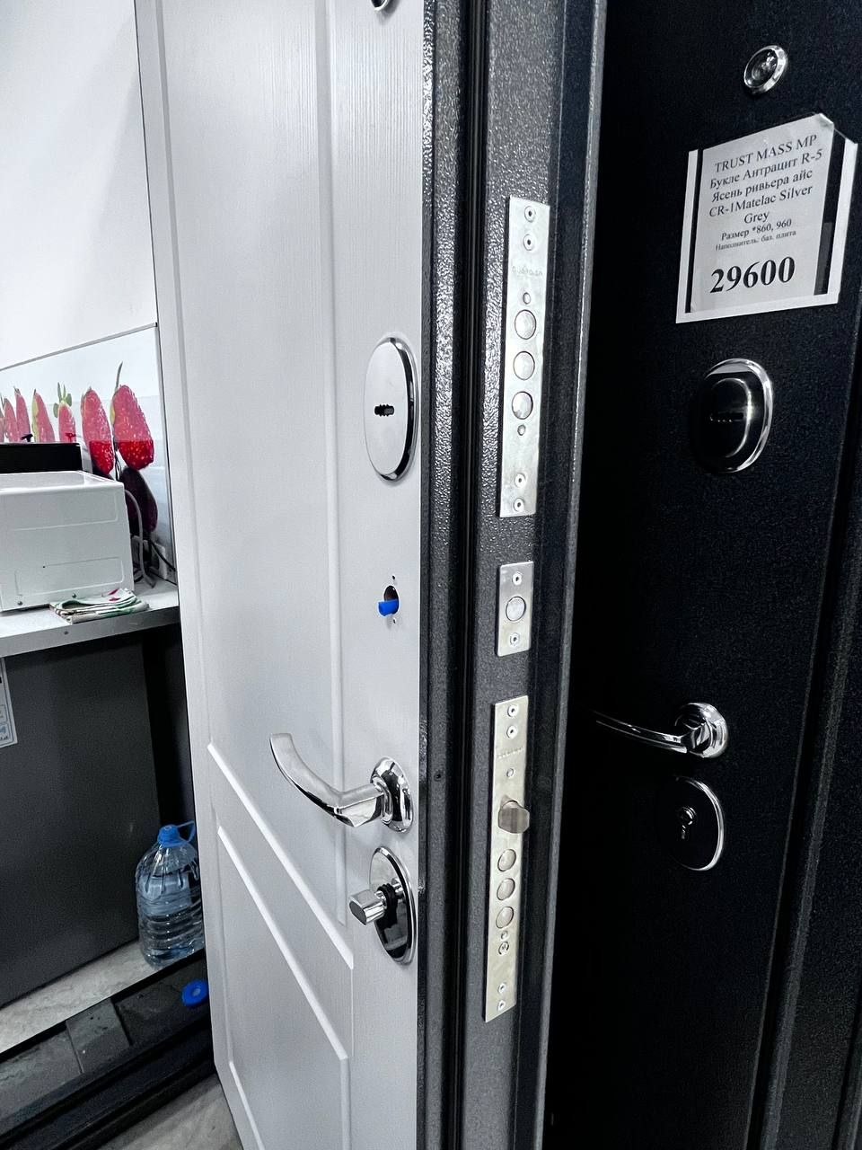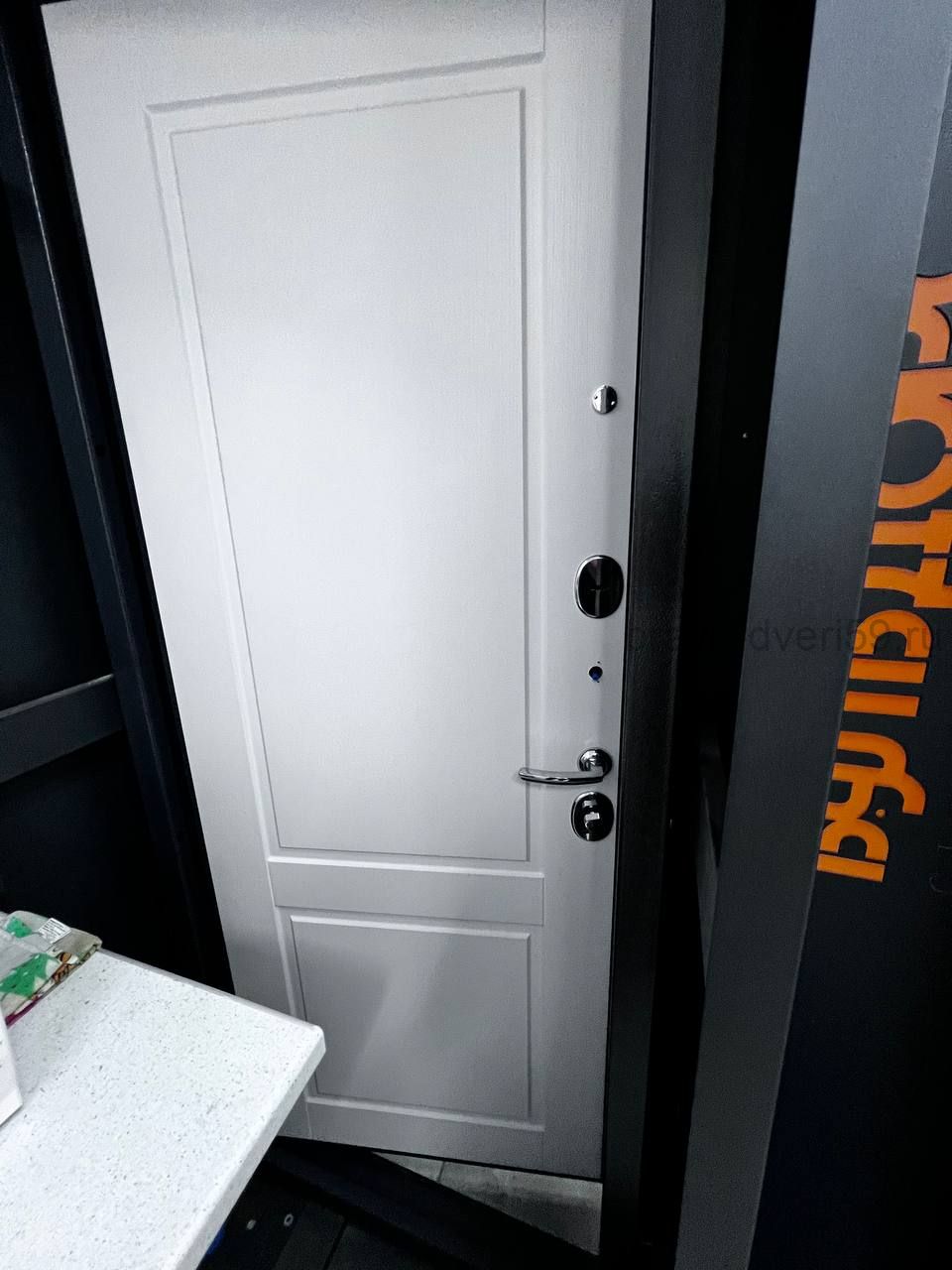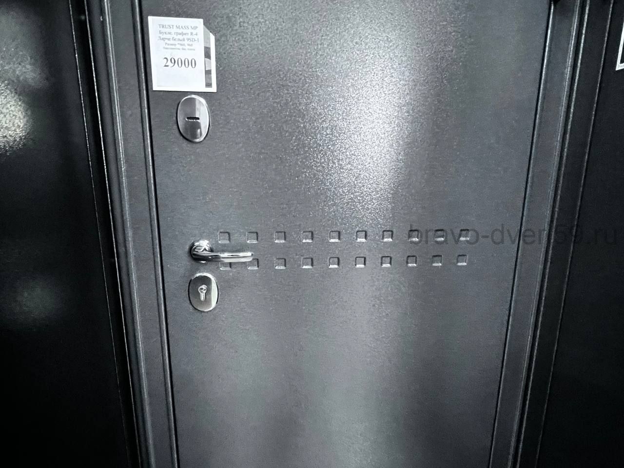 Дверь TRUST MASS MP 9SD-1: наружная отделка — Графит букле, внутренняя — Ларче белый. Толщина 90 мм, утеплённая, два замка, высокий класс безопасности.