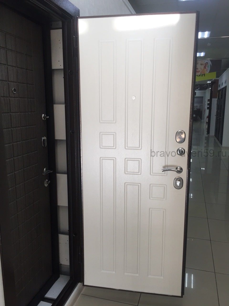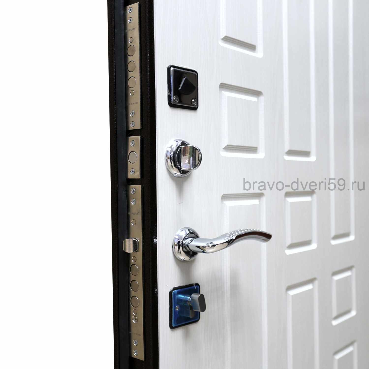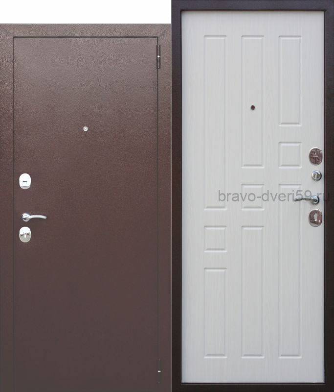Входная металлическая дверь Бридж 8мм. с листом металла толщиной 1.2 мм. и светлой внутренней панелью, подходит для установки в квартиру с темной и маленькой прихожкой. Дверь устанавливается в проем с наличниками.