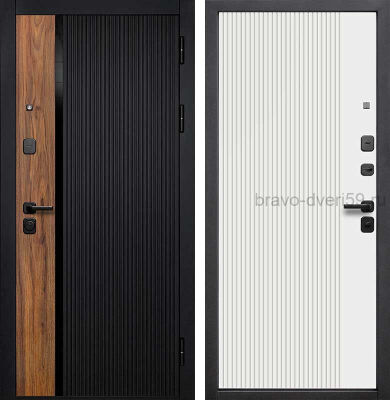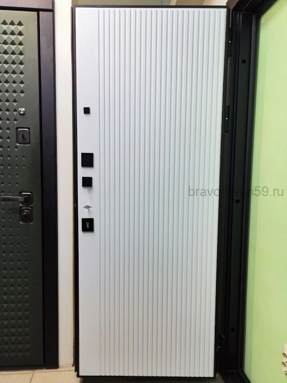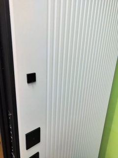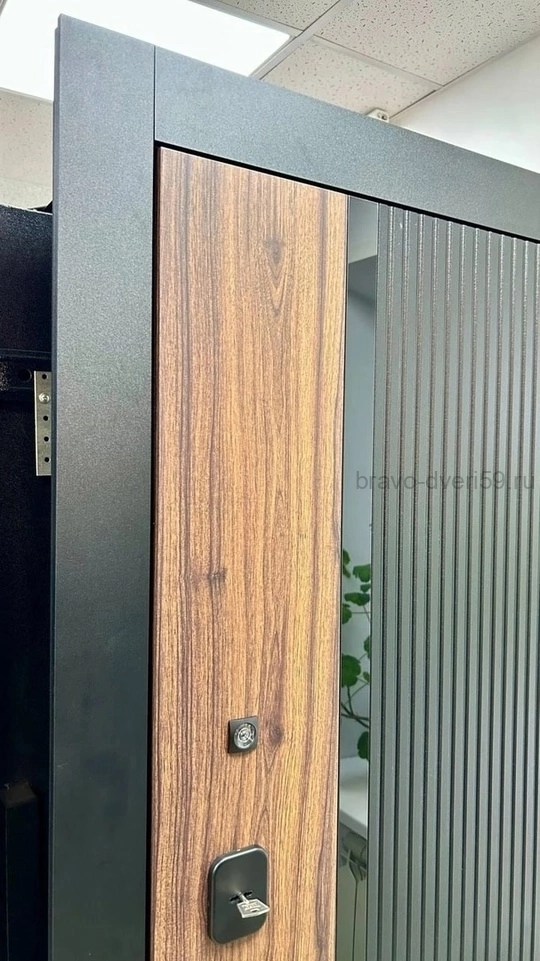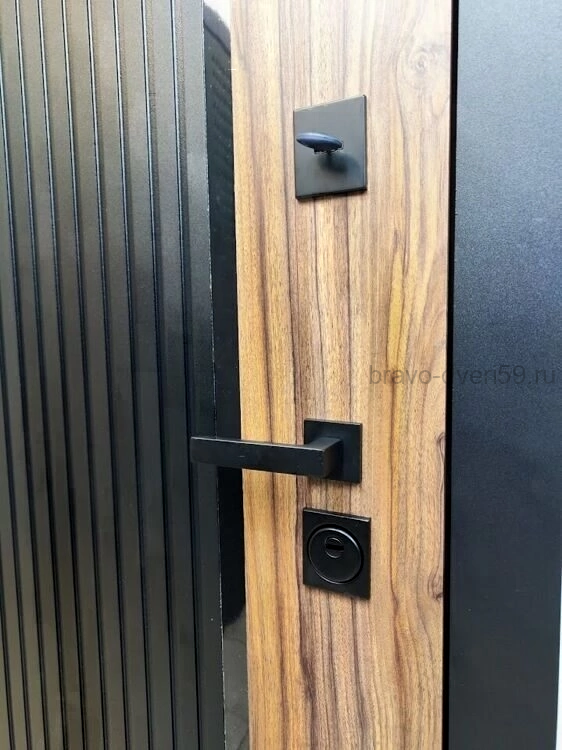 Наружная отделка МДФ-панелью в 2 цветах и стеклянной вставкой выделит её в подъезде, 3 контура, замки 4 класса, броненакладка, ночная задвижка. Купить с доставкой и установкой в Перми можно у нас.