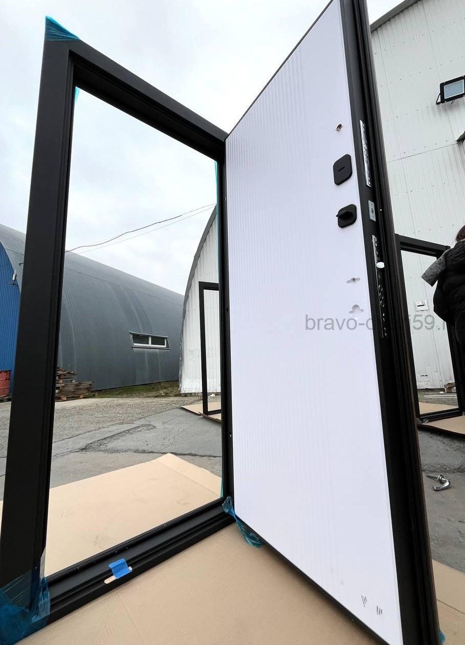Дверь входная 9 см Кантри Эмалит белый изготовлена из металла толщиной 1,5 мм с полимерно-порошковым покрытием, цвет Чёрный муар.