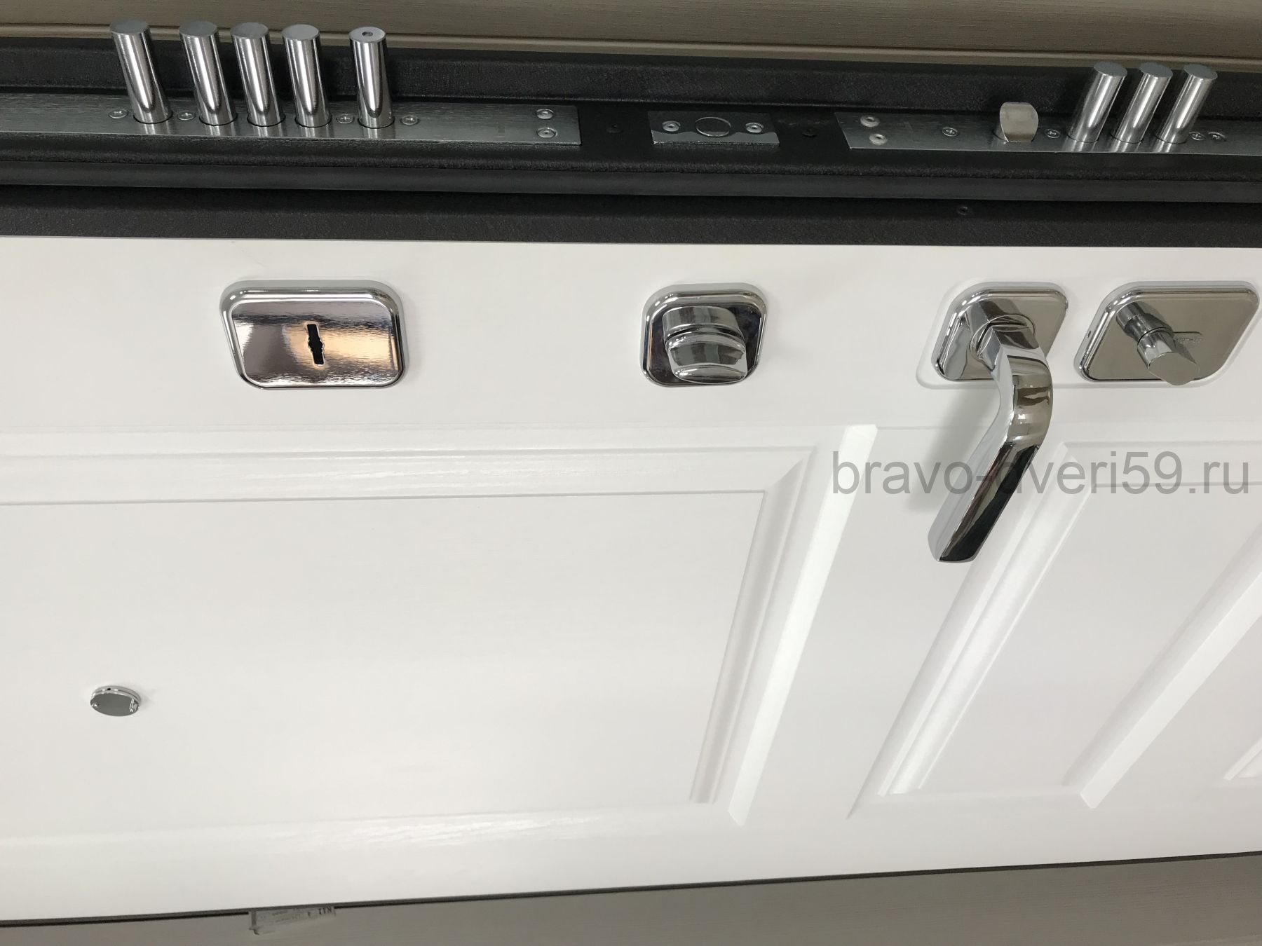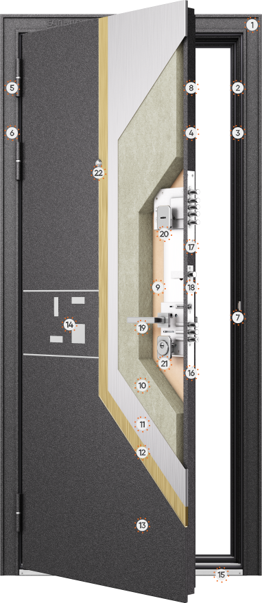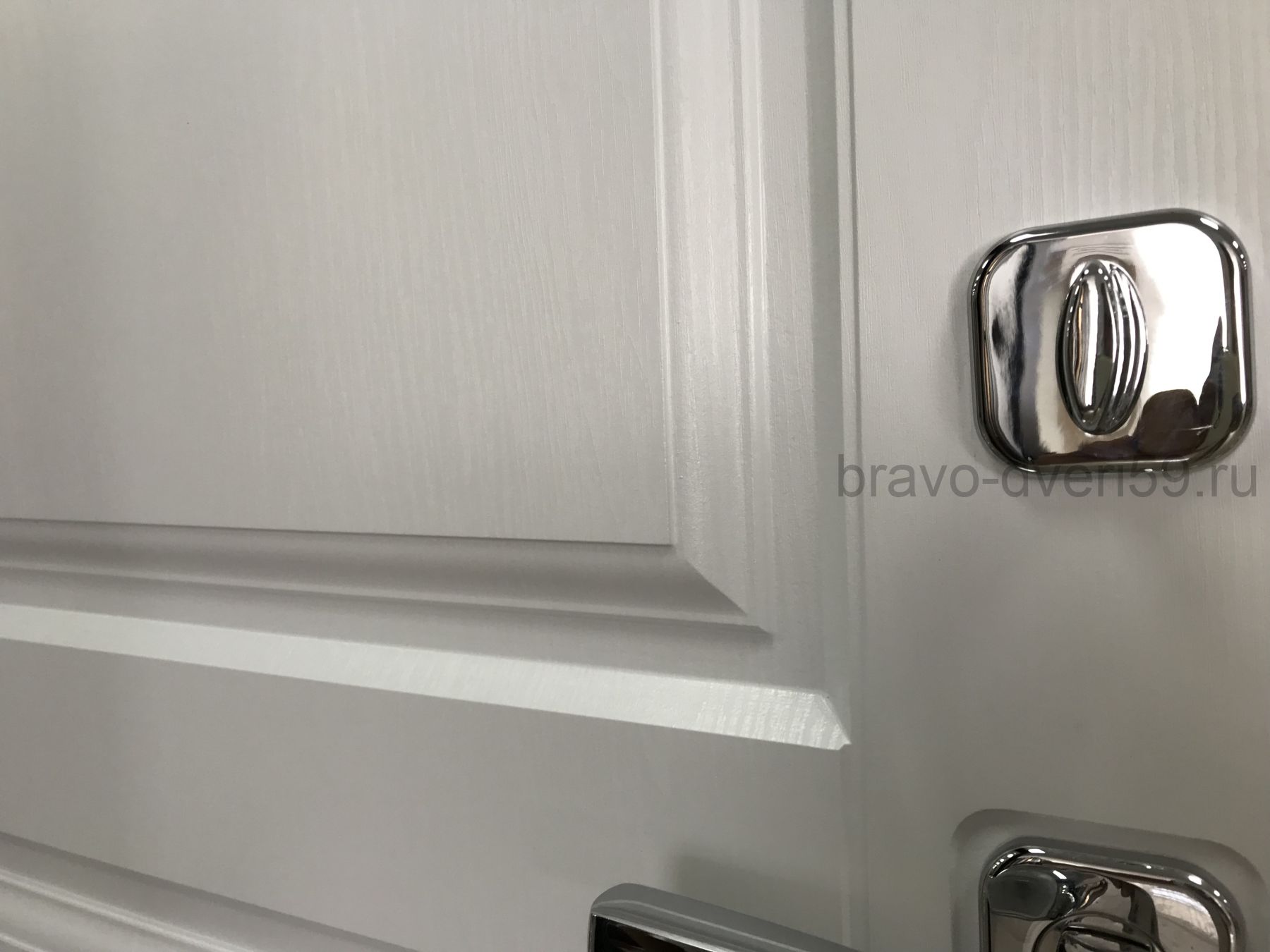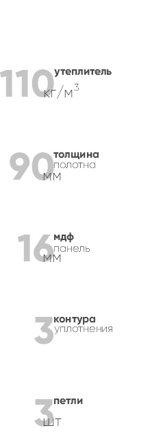 Нельзя не отметить тот факт, что толщина дверного полотна у представителей данной серии составляет 90 мм, в качестве утеплителя используется базальтовая плита плотностью 110 кг/м3, что делает дверь по настоящему тёплой. Внутренняя отделка двери выполнена из МДФ толщиной 16 мм с объёмным фрезерованным рисунком.