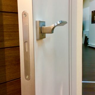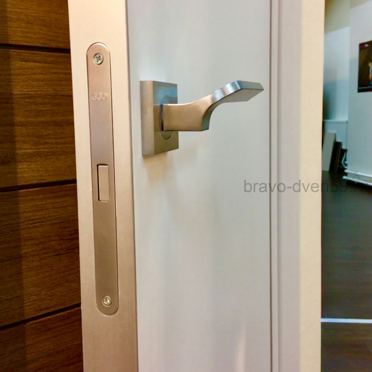 В полотне и коробе вырезаны отверстия под скрытые петли и магнитный замок. Дверь готова к установке