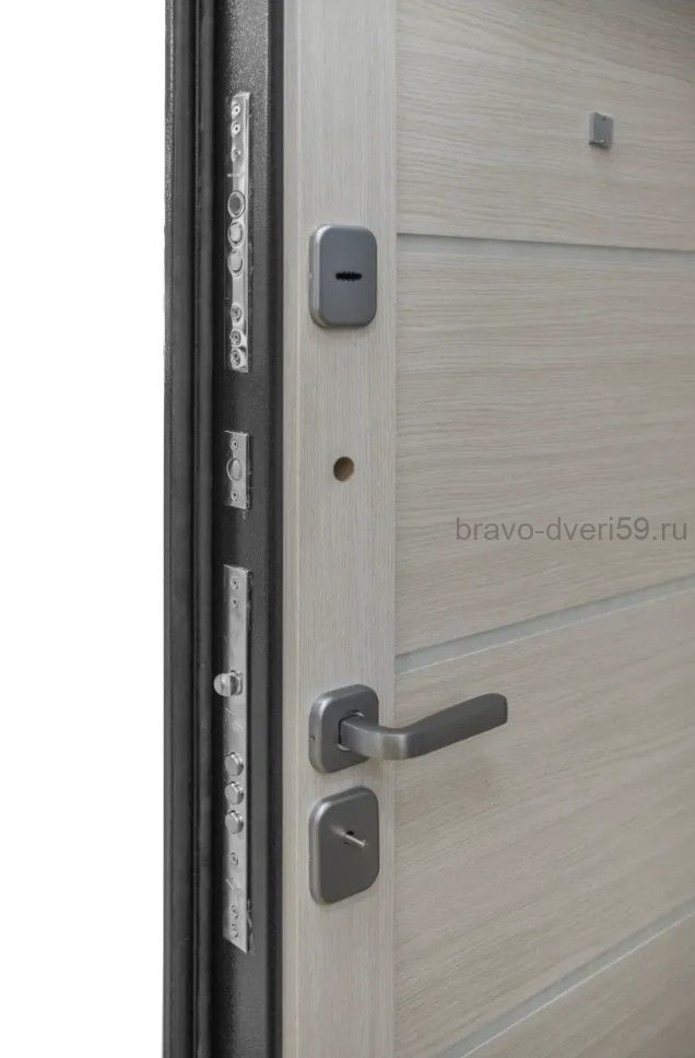 Входная дверь Серебро / Лиственница Беж Царга — это надёжная и стильная дверь с увеличенной толщиной полотна 105 мм, обеспечивающая повышенную тепло- и шумоизоляцию. Модель выполнена из прочной стали, украшена царговой панелью с декоративными вставками Лакобель и станет отличным решением для квартир