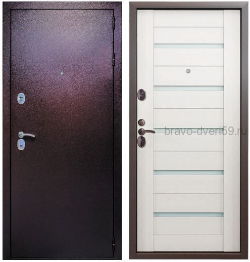 Стальная дверь Аляска Царга PRO в цвете внешней панели Антик медь и внутренней царговой панели Капучино и с 3-мя контурами уплотнения для необходимой защиты Вашей квартиры от посторонних шумов и запахов, внутреннее наполнение с применением базальтовой плиты надежно уберегут Вас от проникновения холода. Замочные карманы с механизмами 2 и 4 класса взломостойкости.
