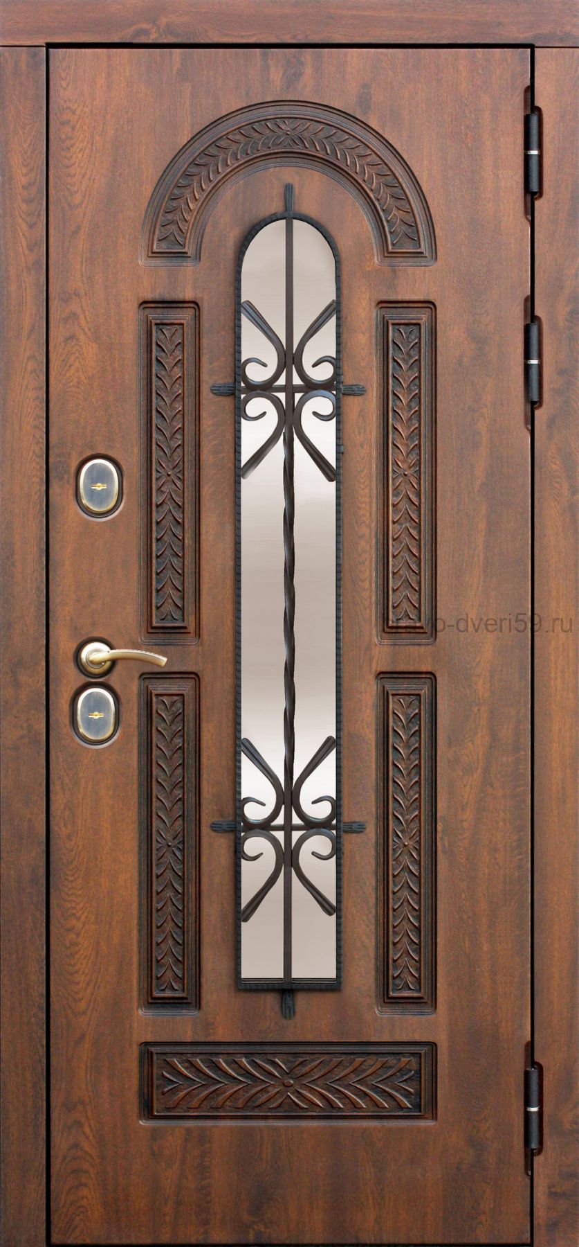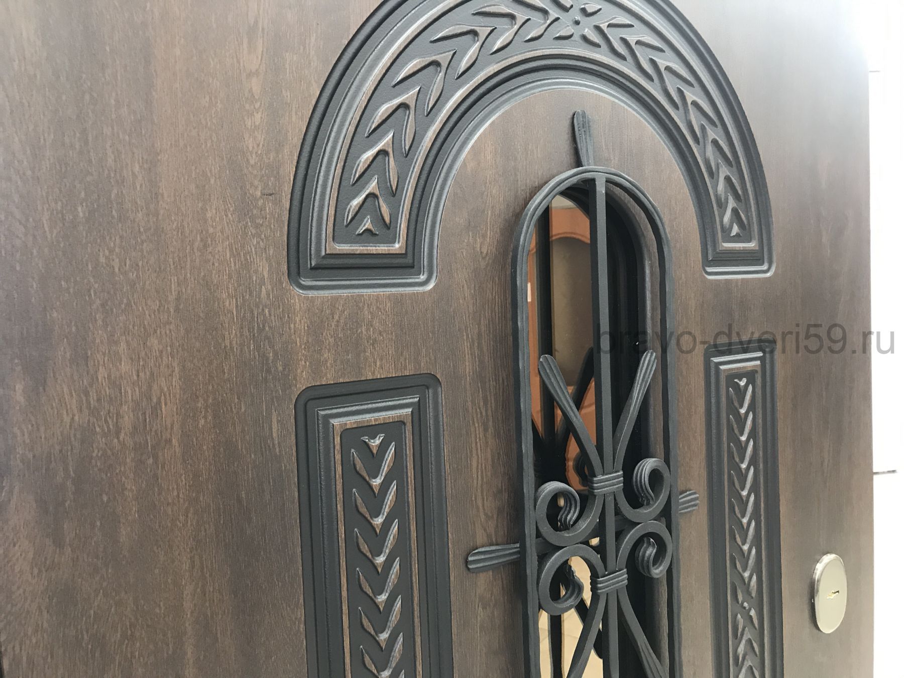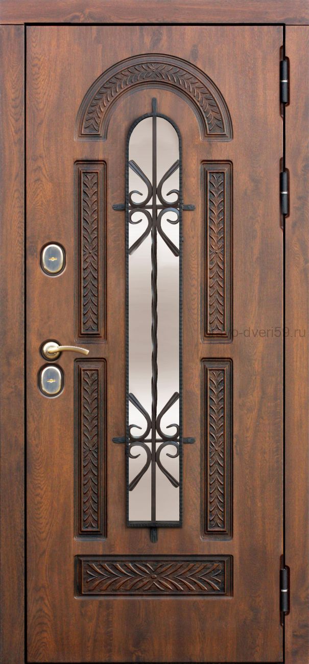 В замковой зоне и в других ключевых местах, дверь усилена дополнительным листом стали. Для придания двери высокой тепло и шумоизоляции, в дверь уложена PIR-плита, один из лучших теплоизоляционных материалов. Он дает двери тепло и шумоизоляцию. По всему периметру полотна двери и дверной коробки установлен фирменный уплотнитель, защищающий от сквозняков. Толщина дверного полотна – 130 мм. Угол распахивания дверного полотна - 180 градусов. Это позволит заносить в квартиру любые крупногабаритные вещи. Снаружи и внутри перед покраской двери грунтуются. Потом дверь окрашивается порошковой краской. Поэтому у двери очень стойкая краска. Наружная поверхность двери помимо окраса порошковой краской, еще оснащена ковкой и зеркальным двухкамерным стеклопакетом, объемной фрезерованной панелю из МДФ 12 мм. Тип пленки "Vinorit". Внутренняя поверхность двери отделана объемной фрезерованной панелью 12 мм. Тип пленки "Vinorit" и самое главное - дверь оборудована терморазрывом - такие двери менее склонный к промерзанию, чем обычные двери.
