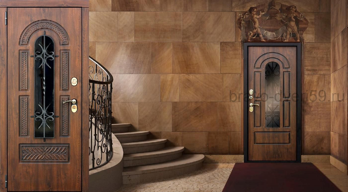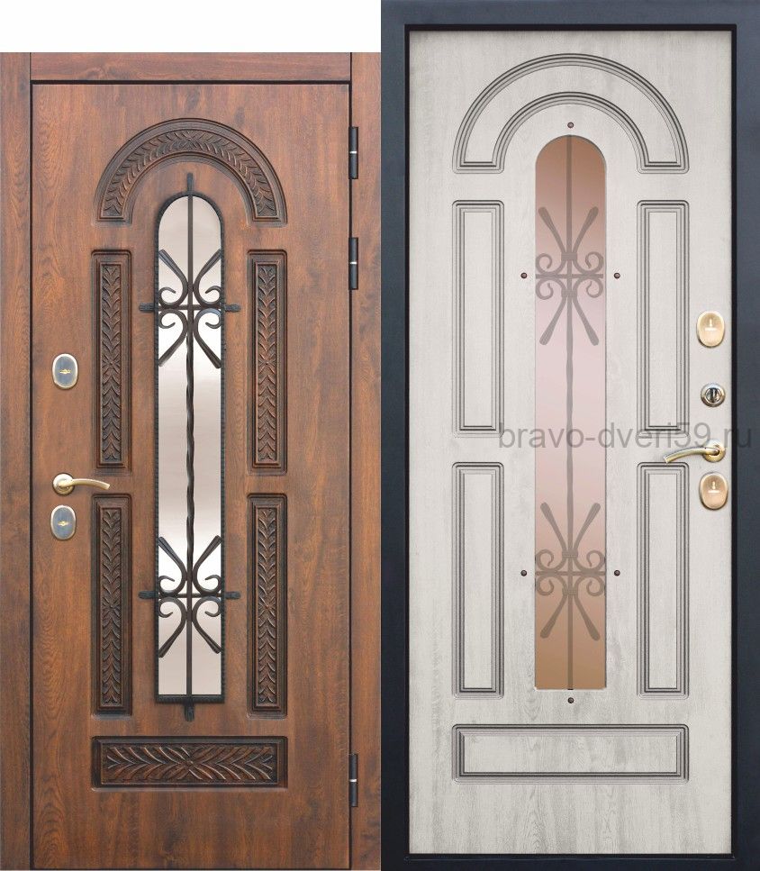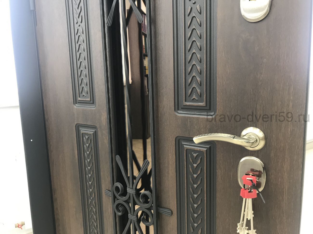 В замковой зоне и в других ключевых местах, дверь усилена дополнительным листом стали. Для придания двери высокой тепло и шумоизоляции, в дверь уложена PIR-плита, один из лучших теплоизоляционных материалов. Он дает двери тепло и шумоизоляцию. По всему периметру полотна двери и дверной коробки установлен фирменный уплотнитель, защищающий от сквозняков. Толщина дверного полотна – 130 мм. Угол распахивания дверного полотна - 180 градусов. Это позволит заносить в квартиру любые крупногабаритные вещи. Снаружи и внутри перед покраской двери грунтуются. Потом дверь окрашивается порошковой краской. Поэтому у двери очень стойкая краска. Наружная поверхность двери помимо окраса порошковой краской, еще оснащена ковкой и зеркальным двухкамерным стеклопакетом, объемной фрезерованной панелю из МДФ 12 мм. Тип пленки "Vinorit". Внутренняя поверхность двери отделана объемной фрезерованной панелью 12 мм. Тип пленки "Vinorit" и самое главное - дверь оборудована терморазрывом - такие двери менее склонный к промерзанию, чем обычные двери.