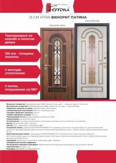 Дверь Феррони Витра отличный вариант для покупки и установки в загородный дом или на дачу. При не высокой стоимости, дверь обладает всеми необходимыми свойствами противовзломной двери для установки на границу улица/дом: холоднокатанная сталь 1,5 мм, противосъемные ригеля, многослойное наполнение полотна. Купив данную модель двери, Вы будете приятно удивлены высоким качеством по довольно демократичной цене для дверей такого класса.